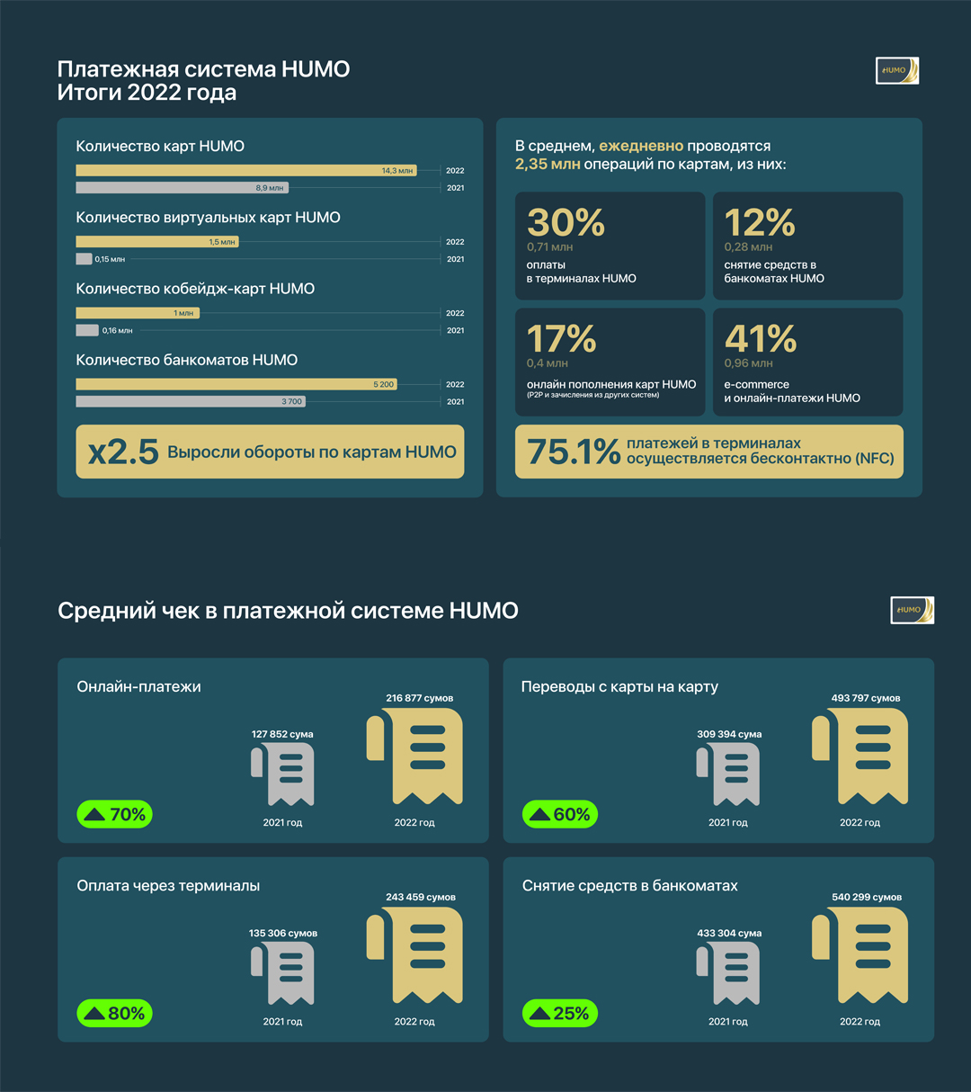 Национальный межбанковский процессинговый центр представляет показатели по итогам деятельности Национальной платёжной системы «HUMO» за 2022 год.