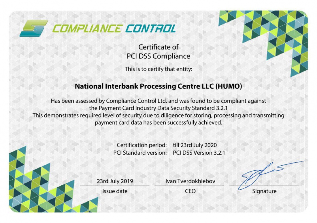 получил международный сертификат соответствия требованиям безопасности PCI DSS (Payment Card Industry Data Security Standard) версии 3.2.1. В ходе проверки техническая база НМПЦ показала полное соответствие высоким требованиям информационной безопасности международного стандарта и подтвердила высокую степень защиты данных платежной системы HUMO.